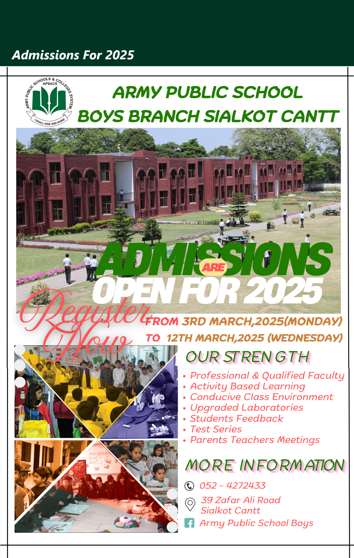 At Army Public School, we strive to nurture scholarship, character, and discipline. Our classrooms encourage inquiry and teamwork; our house system and sports build resilience and leadership. With parents as partners, we shape confident young men ready to serve their community and their nation.